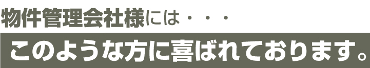 今までは管理会社に任せっぱなしの案件でイメージ通りにいかなかった。施工完了までに時間がかかってしまった。少しの事なのに多額の請求がかかってしまった。そんな方には是非ご利用下さい。私たちは部門別にはなりますが、その分野のおいては管理会社などを通しませんので、迅速な対応が可能です。今までは管理会社指定の業者しかダメ・物件別に管理会社が違ってその都度業者が違う・毎回同じような指示を出さなければならいなど制約が多くうまくいかなかったことも多々あったかと思います。これからは一括管理でまたご希望でしたら直接現場にて指示して頂いております。作業内容も確認出来ますので、お客様には大変安心されております。また中間を省きますので、コスト面においてもリーズナブルな価格にりそちらの方面でもオーナー様にはご満足されており指示されております。